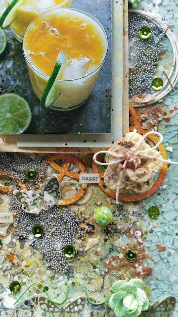 He elegido colores muy frescos y alegres como amarillos, naranjas y verdes...y he utilizado muchas texturas y brillos. Los productos así como el papel, la plantilla y las texturas son de 13@arts.